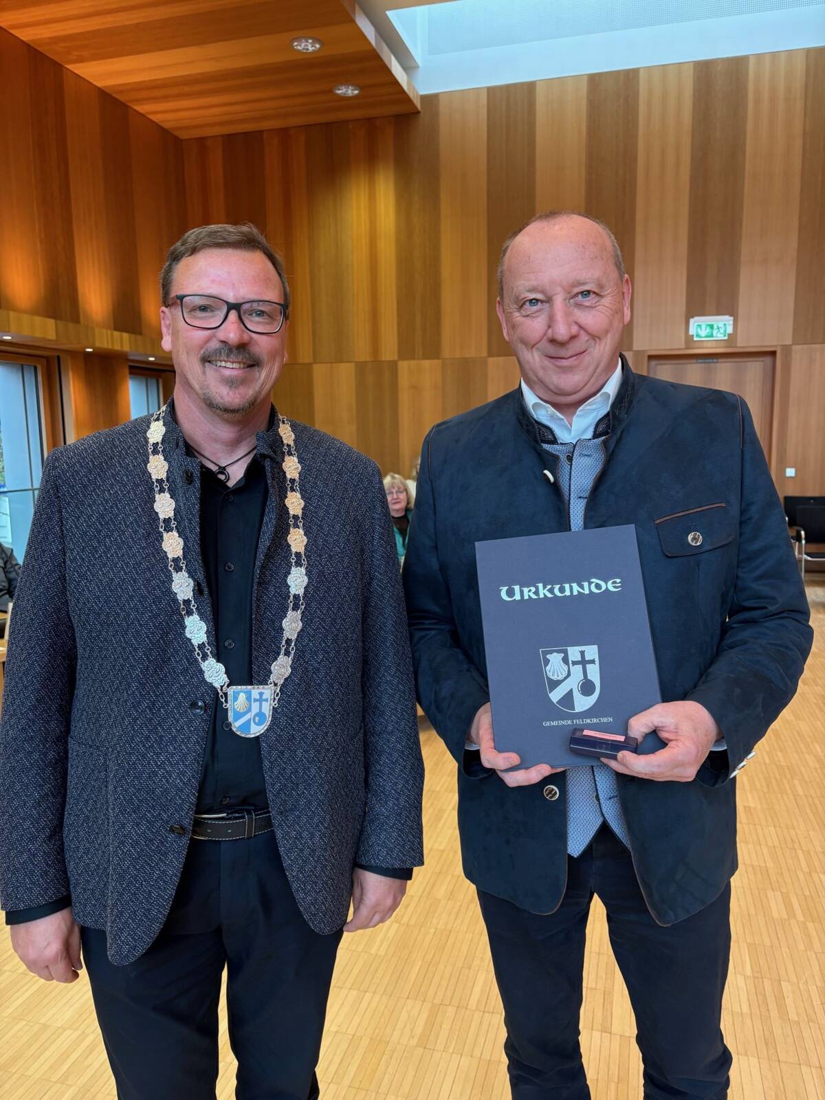 Darüber hinaus wurden Feldkirchens 3. Bürgermeister Daniel Golibrzuch, Martin Obergroßberger, Brigitte Pfaffinger, Silvia Ritter, Tanja Schmitt, Tobias Schmitt und Leonard Wagner für sechs Jahre Tätigkeit im Gemeinderat mit der Feldkirchner Ehrennadel in Bronze und einer Urkunde geehrt.